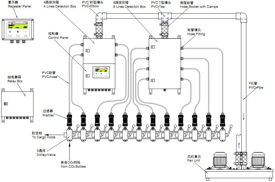 本系統(tǒng)用于貨艙的煙霧監(jiān)測,當系統(tǒng)啟動后,風機從貨艙中抽吸氣體樣品,氣體樣品通過管路流經粉塵過濾器,再到探測箱,探測箱內各獨立探頭檢測氣體樣品中煙霧濃度,并將分析結果反饋到控制器,當被監(jiān)控區(qū)域的煙霧濃度達到控制器報警閥門值時,系統(tǒng)會發(fā)出聲光報警和文字提示;同時系統(tǒng)有自身故障診斷的能力,當系統(tǒng)發(fā)生故障時,系統(tǒng)會出現(xiàn)聲光報警和文字提示。(12路SES-36貨艙抽煙探測系統(tǒng)的常見配置)